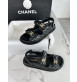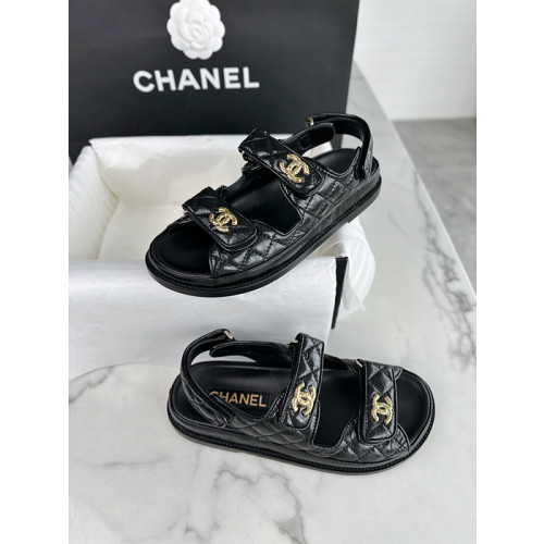 고급스러운 블랙 퀼팅 가죽과 빛나는 샤넬 CC 로고 디테일이 조화를 이루는 세련된 샌들